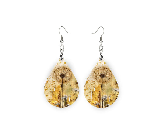 Golden Dandelion Earrings Print Tear Drop Wood Dangle Earrings Hypoallergenic Jewelry