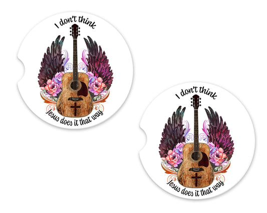 Set of 2 I Don't Think Jesus Does it That Way Guitar Sandstone Car Coasters, Car Accessory
