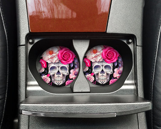 New Release, Set of 2 Pink Roses Day of the Dead Sandstone Car Coasters, Car Accessory