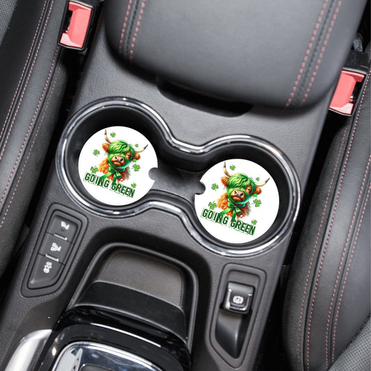 New Release, Set of 2 St. Patrick's Day Highland Cow Going Green Sandstone Car Coasters, Car Accessory
