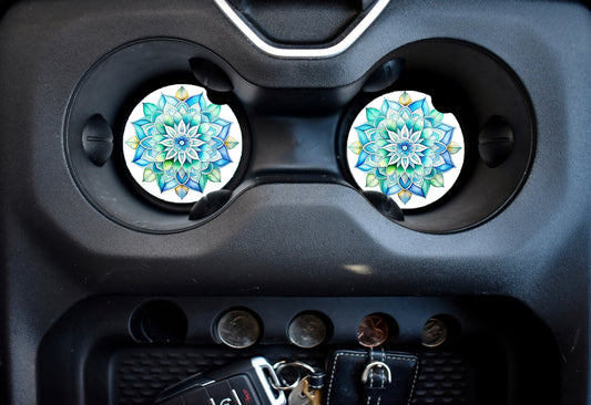 Set of 2 Blue Green Mandala Sandstone Car Coasters