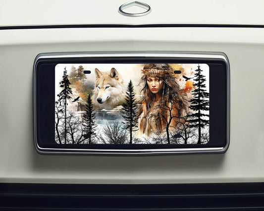 Vanity Front License Plate Indigenous Girl & White Wolf Aluminum Vanity License Plate Car Accessory Decorative Front Plate