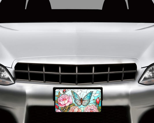 Blue Stain Glass Butterfly Vanity Front License Plate, Aluminum Vanity License Plate Car Accessory Decorative Front Plate