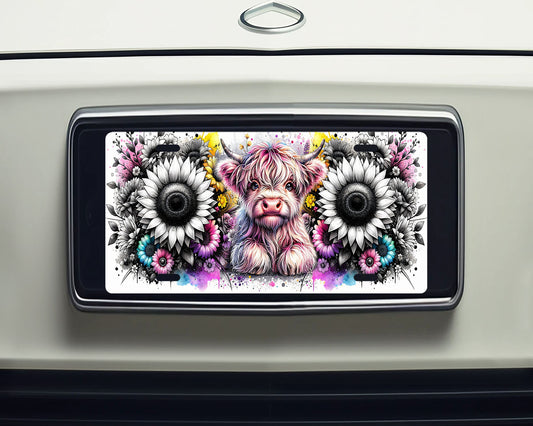 Vanity Front License Plate, Highland Cow and Flowers Aluminum License Plate Car Accessory Decorative Front Plate