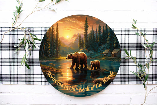 New Release Bears at Sunset Welcome Sign, Farmhouse Round Wood Sign, Door Hanger Wreath Sign