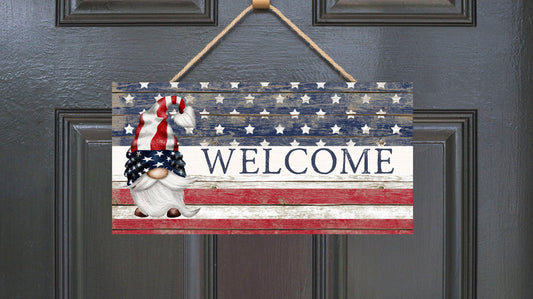 Welcome Gnome American Flag Printed Handmade Wood Sign