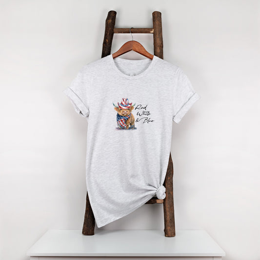 Red White and Blue Highland Cow Tshirt, T Shirt, Patriotic, American Flag Tshirt, Graphic T's 100% Cotton Black White or Gray, Tee
