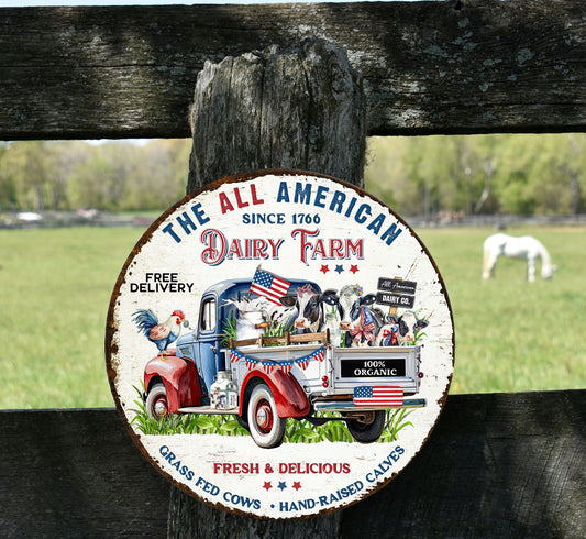 All American Dairy Farm Farmhouse Sign Round Printed Handmade Wood Sign, Door Hanger, Wreath Sign