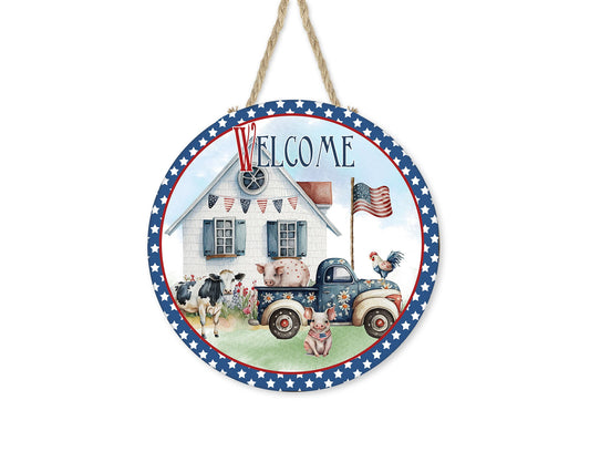 New Release Patriotic Farmhouse Welcome Round Printed Handmade Wood Sign Farmhouse Door Hanger Wreath Sign