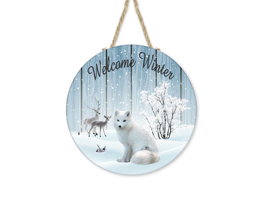 Welcome Winter White Fox Sign, Farmhouse Round Wood Sign Farmhouse Door Hanger Wreath Sign