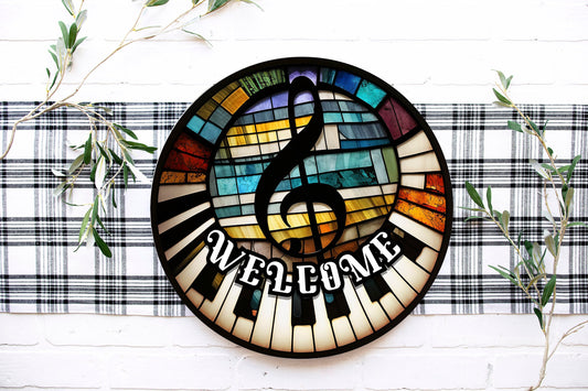 Faux Stain Glass Piano Welcome Sign, Farmhouse Round Wood Sign Farmhouse Door Hanger Wreath Sign