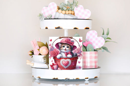 Valentine Kitty in Hat Valentines Day Wood Mini Sign, Tier Tray Decor, Kitchen Sign, Farmhouse Decor, Wreath Sign, Door Hanger