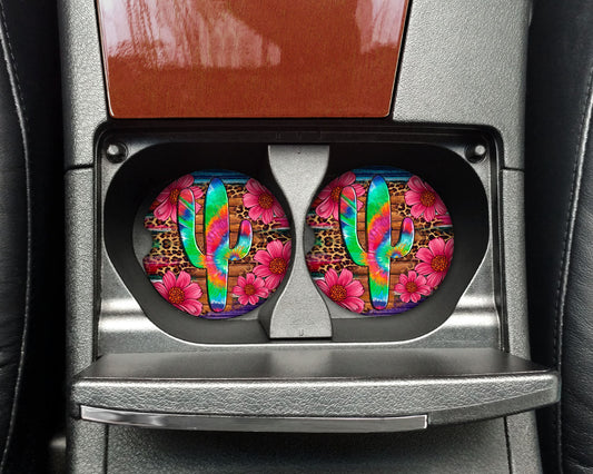 Set of 2 Tie Dye Cactus Sandstone Car Coasters