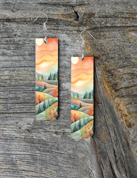 Watercolor Foothills Earrings, Printed Wood Dangle Earrings Hypoallergenic Jewelry Handmade