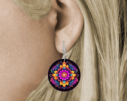 Lotus Mandala Round Wood Dangle Earrings Hypoallergenic Jewelry