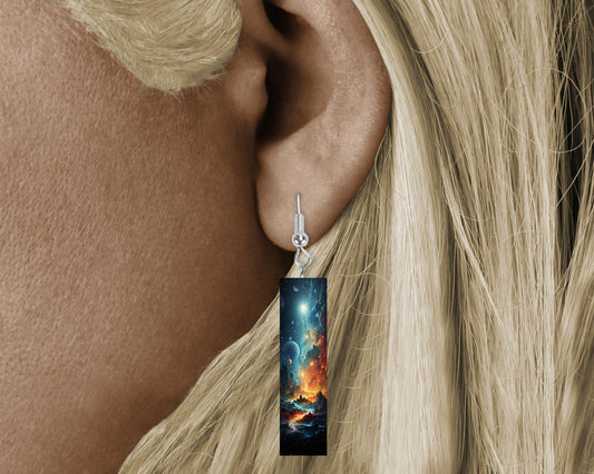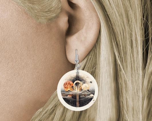 Outer Space World Printed Wood Dangle Earrings Hypoallergenic Jewelry Handmade