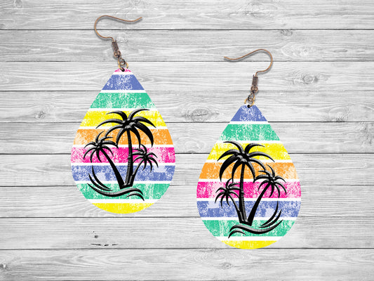 Rainbow Palms Print Tear Drop Wood Dangle Earrings Hypoallergenic Jewelry