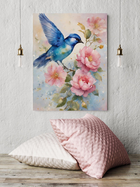 16x20 Blue Bird and Pink Flowers Wall Art Canvas Print