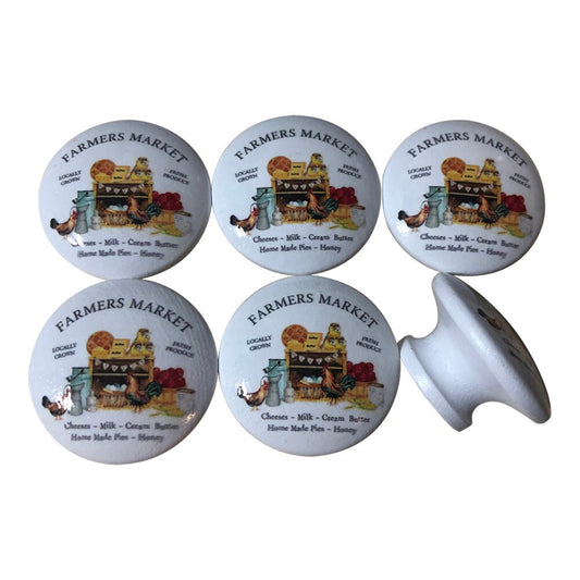 Cabinet Knobs and Drawer Pulls, Set of 6 Chicken Farmers Market Print Wood Cabinet Knobs, Farmhouse Knobs, Kitchen Cabinet Knobs