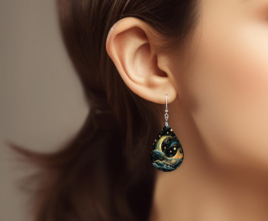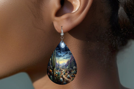 Moonlit Desert Earrings Print Tear Drop Wood Dangle Earrings Hypoallergenic Jewelry
