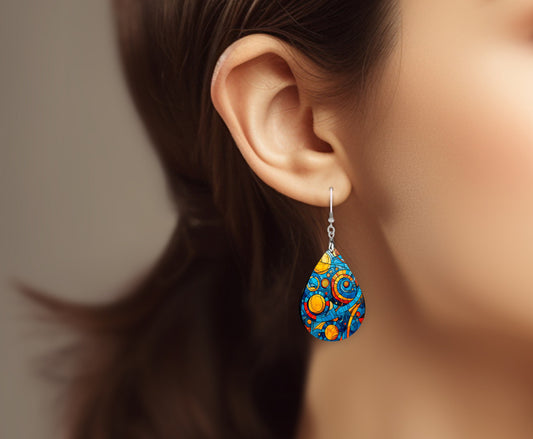 Abstract Stary Night Print Earrings Print Tear Drop Wood Dangle Earrings Hypoallergenic Jewelry