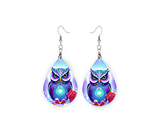 Blue Owls Tear Drop Dangle Printed Earrings Jewelry Handmade