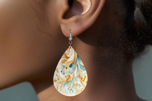 Gold, White and Blue Swirl Print Earrings Print Tear Drop Wood Dangle Earrings Hypoallergenic Jewelry