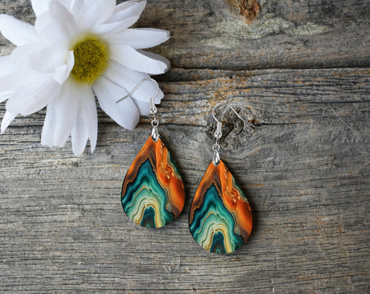 Green and Orange Agate Print Earrings Print Tear Drop Wood Dangle Earrings Hypoallergenic Jewelry