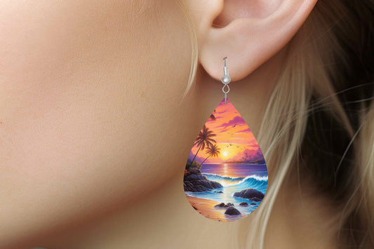 Beach Sunset Print Earrings Print Tear Drop Wood Dangle Earrings Hypoallergenic Jewelry