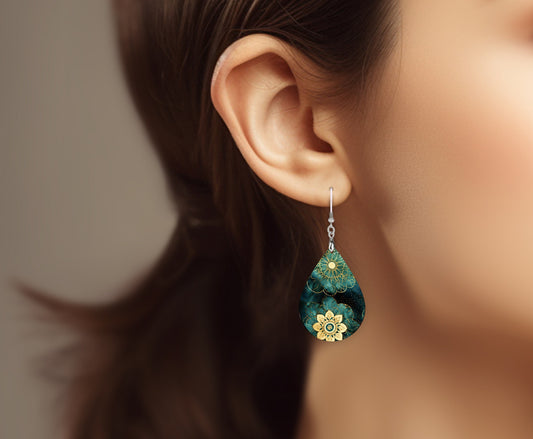 Green Gold Mandala Print Earrings Print Tear Drop Wood Dangle Earrings Hypoallergenic Jewelry