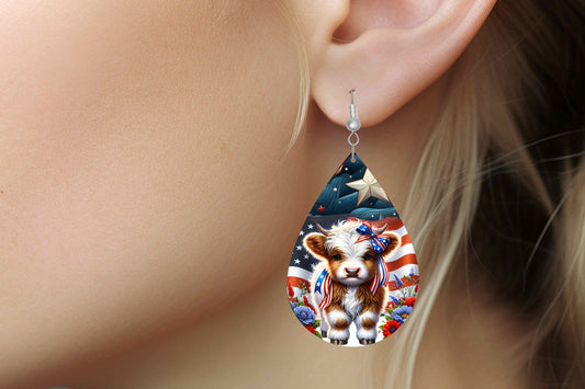 New Release Stars and Stripes Highland Cow Tear Drop Wood Dangle Earrings Hypoallergenic Jewelry