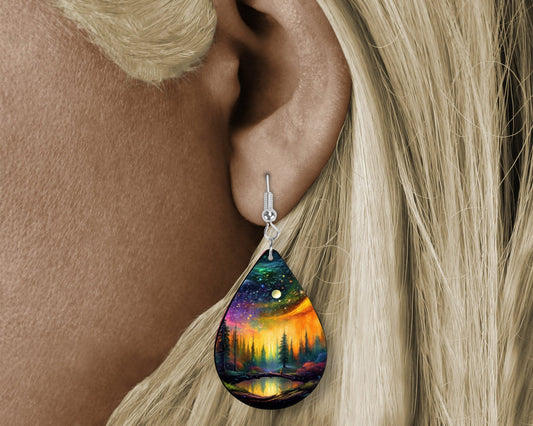 Northern Lights Over Lake Print Earrings Print Tear Drop Wood Dangle Earrings Hypoallergenic Jewelry