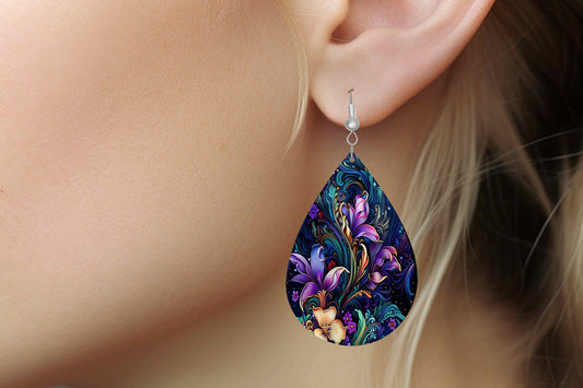 Floral Bioluminescence Print Earrings Print Tear Drop Wood Dangle Earrings Hypoallergenic Jewelry