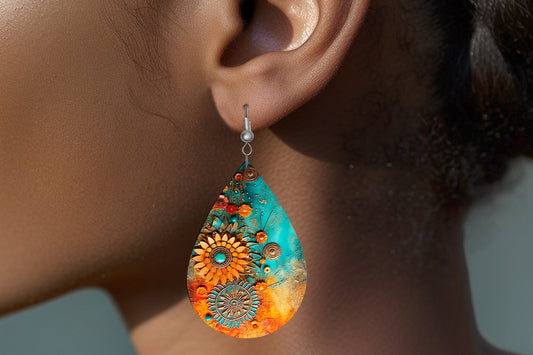 Orange Turquoise Floral Earrings Print Tear Drop Wood Dangle Earrings Hypoallergenic Jewelry