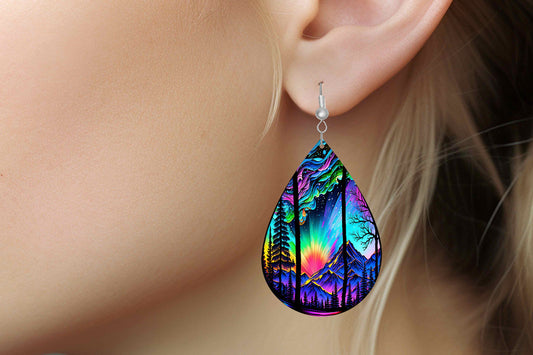 New Release Northern Lights Sunset Print Earrings Print Tear Drop Wood Dangle Earrings Hypoallergenic Jewelry