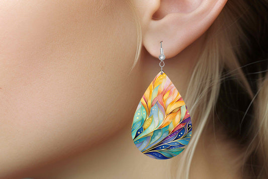 Rainbow Palm Leaves Print Earrings Print Tear Drop Wood Dangle Earrings Hypoallergenic Jewelry