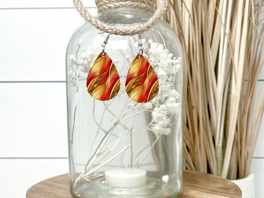 Red and Gold Art Nouveau Earrings Print Tear Drop Wood Dangle Earrings Hypoallergenic Jewelry