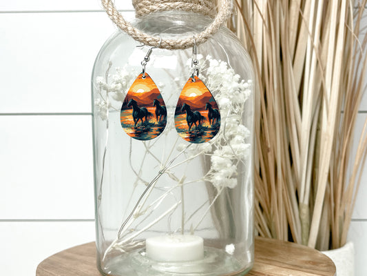 Sunset Horses Print Tear Drop Wood Dangle Earrings Hypoallergenic Jewelry