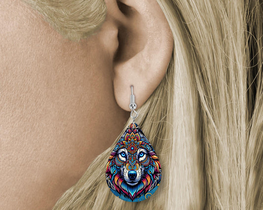 Mandala Wolf Teardrop Wood Dangle Earrings Hypoallergenic Jewelry
