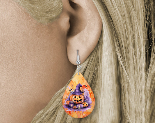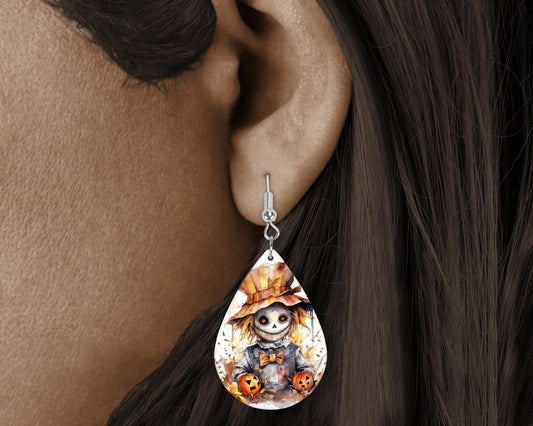 Fall Halloween Earrings Scarecrow and Pumpkins Print Tear Drop Wood Dangle Earrings Hypoallergenic Jewelry