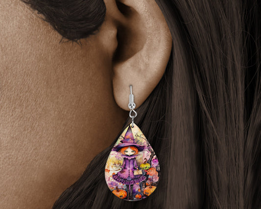 Fall Halloween Earrings Witch in Purple Print Tear Drop Wood Dangle Earrings Hypoallergenic Jewelry