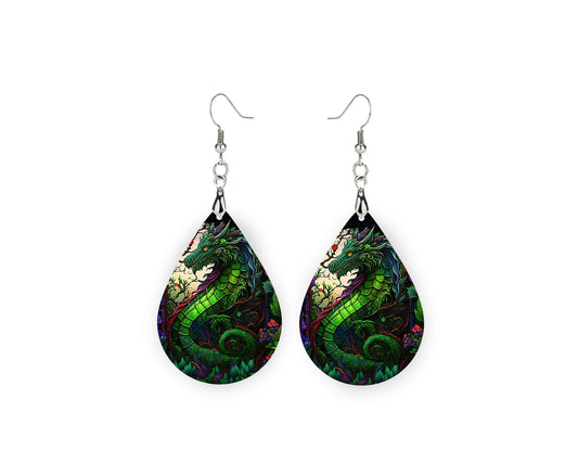 Green Dragon Earrings Print Tear Drop Wood Dangle Earrings Hypoallergenic Jewelry