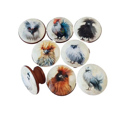 Silkie Chickens Cabinet and Drawer Knobs, Set of 8 Wood Drawer Knobs and Pulls, Kitchen Cabinet Knobs