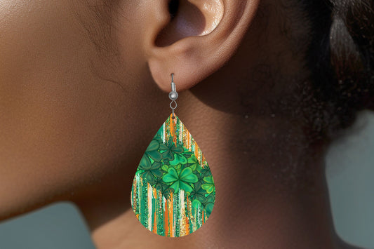 St. Patrick's Day Clover Print Tear Drop Wood Dangle Earrings Hypoallergenic Jewelry
