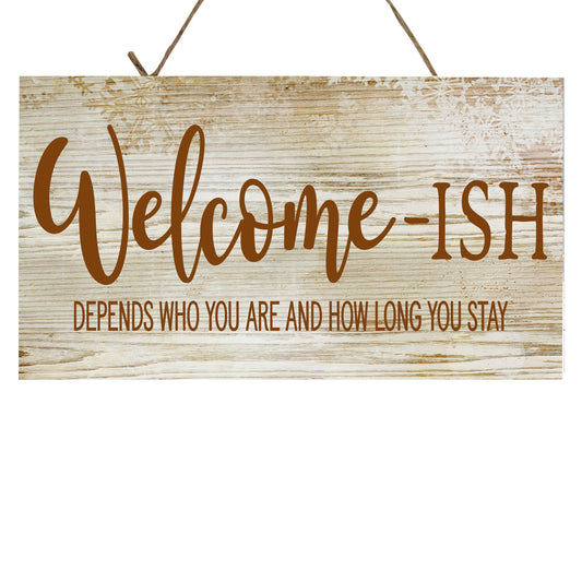 Bienvenido-ish depende de quién eres y cuánto tiempo te quedas en la granja, letrero de madera hecho a mano impreso