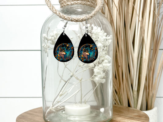 Wolf Dream Catcher Print Earrings Print Tear Drop Wood Dangle Earrings Hypoallergenic Jewelry