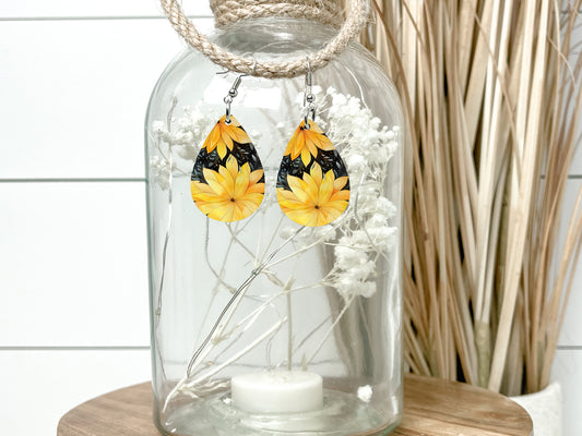 Yellow Flowers on Black Earrings, Teardrop Dangle Printed Earrings Jewelry Handmade