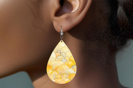Yellow Fans Print Earrings, Teardrop Dangle Printed Earrings Jewelry Handmade