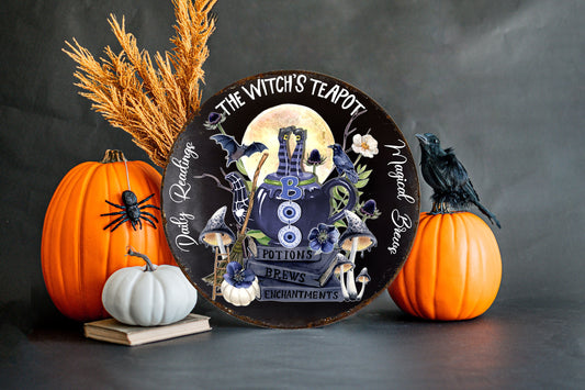 Tetera de brujas Halloween redondo impreso hecho a mano cartel de madera