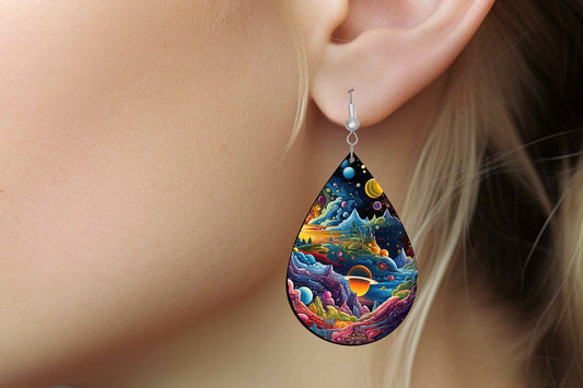 Alien Planet Print Earrings Print Tear Drop Wood Dangle Earrings Hypoallergenic Jewelry